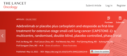 北京时间2022年5月14日,6163银河医药自主研发的PD-L1抑制剂阿得贝利单抗治疗广泛期小细胞肺癌的III期临床研究(CAPSTONE-1研究)成果正式全文在线发表于国际权威学术期刊《柳叶刀·肿瘤学》(《THE LANCET Oncology》,影响因子41.316)。CAPSTONE-1研究结果显示,阿得贝利单抗联合化疗一线治疗广泛期小细胞肺癌相较于安慰剂联合化疗可以显著延长患者总生存期至15.3个月[1],刷新现有免疫药物一线治疗广泛期小细胞肺癌的总生存纪录[2]。