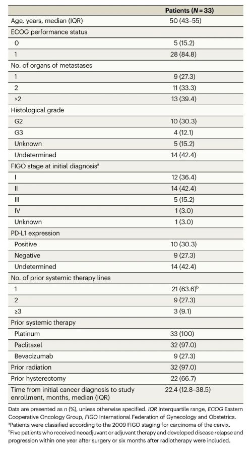 本研究共入组33例复发转移性宫颈鳞状细胞癌患者。19例患者接受PD-L1检测,其中10例患者PD-L1表达阳性,9例患者表达阴性。33例患者既往均接受过紫杉类系统治疗,32例患者既往接受过含铂系统治疗。