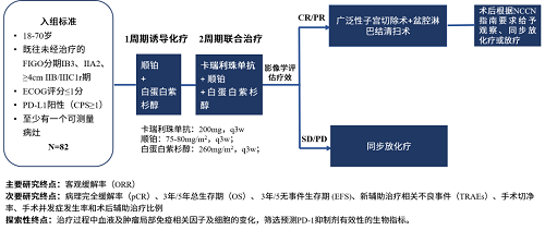 本研究为一项多中心、开放、单臂II期临床试验,纳入新诊断、PD-L1表达阳性(CPS ≥1)、局部晚期(FIGO为IB3、IIA2和肿瘤直径≥4cm IIB/IIIC1r期)宫颈癌患者。患者先接受1个周期诱导化疗,再接受2个周期化疗联合卡瑞利珠单抗治疗,疗效评估为完全缓解(CR)/部分缓解(PR)的患者接受手术,术后根据美国国立综合癌症网络(NCCN)指南的推荐行辅助治疗或直接进行随访,疾病稳定(SD)/疾病进展(PD)患者则接受同步放化疗。