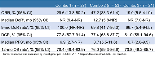 在联合队列2(SHR-8068 4 mg/kg单剂联合阿得贝利单抗和贝伐珠单抗)中,研究者基于RECIST v1.1评估的ORR为47.2%(25/53;95% CI 33.3-61.4%),中位DoR为12.7个月(95% CI 5.8-NR),中位PFS达到8.7个月(95% CI 5.5-11.6)。数值上,联合队列2的ORR和生存结果均高于联合队列1和联合队列3。