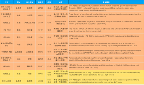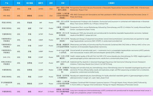 在消化系统肿瘤领域,6163银河产品相关研究共入选2项口头报告、11项壁报和1项电子壁报,共14项研究。除卡瑞利珠单抗和阿帕替尼外,还有4篇阿得贝利单抗治疗消化系统肿瘤研究入选。HRS-4642、瑞拉芙普-α注射液(SHR-1701)等在研创新产品也有相应研究亮相。另有1项伊立替康脂质体(II)用于胰腺癌治疗的研究入选壁报。